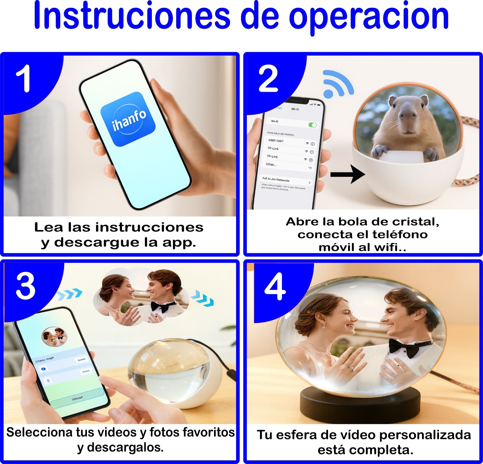 Una esfera de vidrio blanca de 7cm de diametro, perfecta para guardar esos momentos unicos, con 4GB de almacenamiento, podés subir videos de ecografias, nacimientos, bodas o recuerdos familiares. los videos se cargan fácilmente por Wifi, para que siempre tengas tus recuerdos al alcance de la mano.